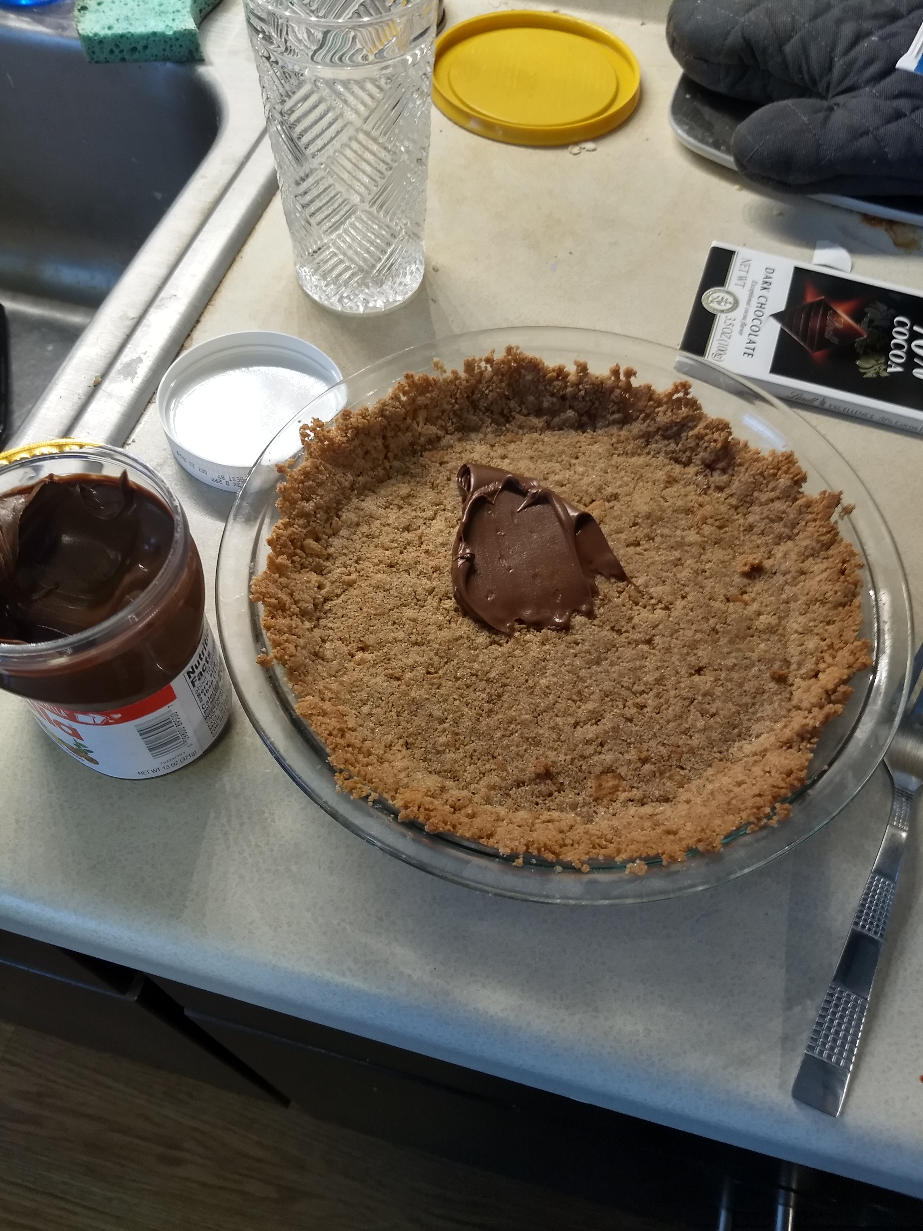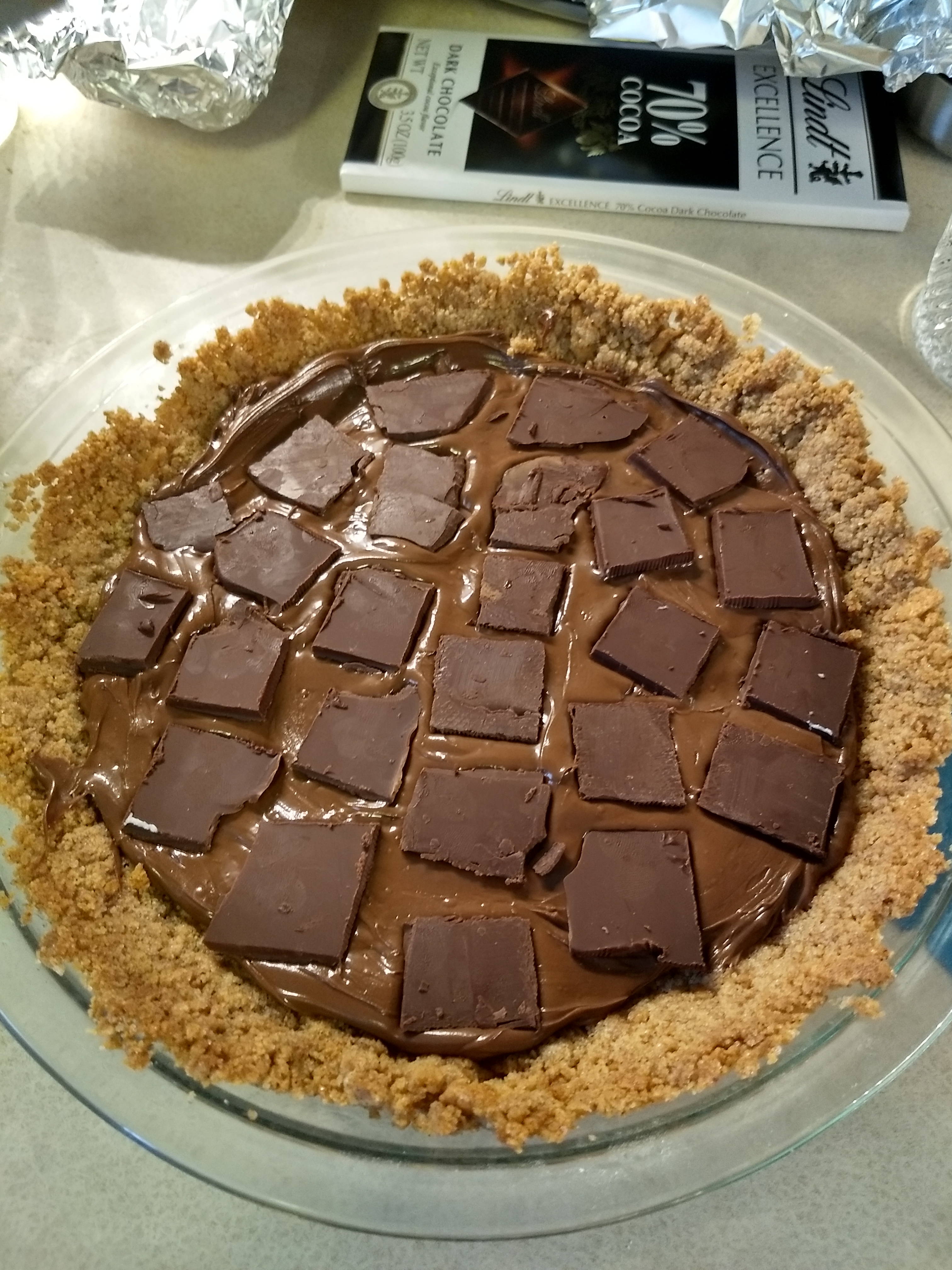 Spread the nutella (gently) into the cooled crust. Arrange chocolate squares in some cool pattern that won’t be visible in the final dish, and press firmly into nutella.