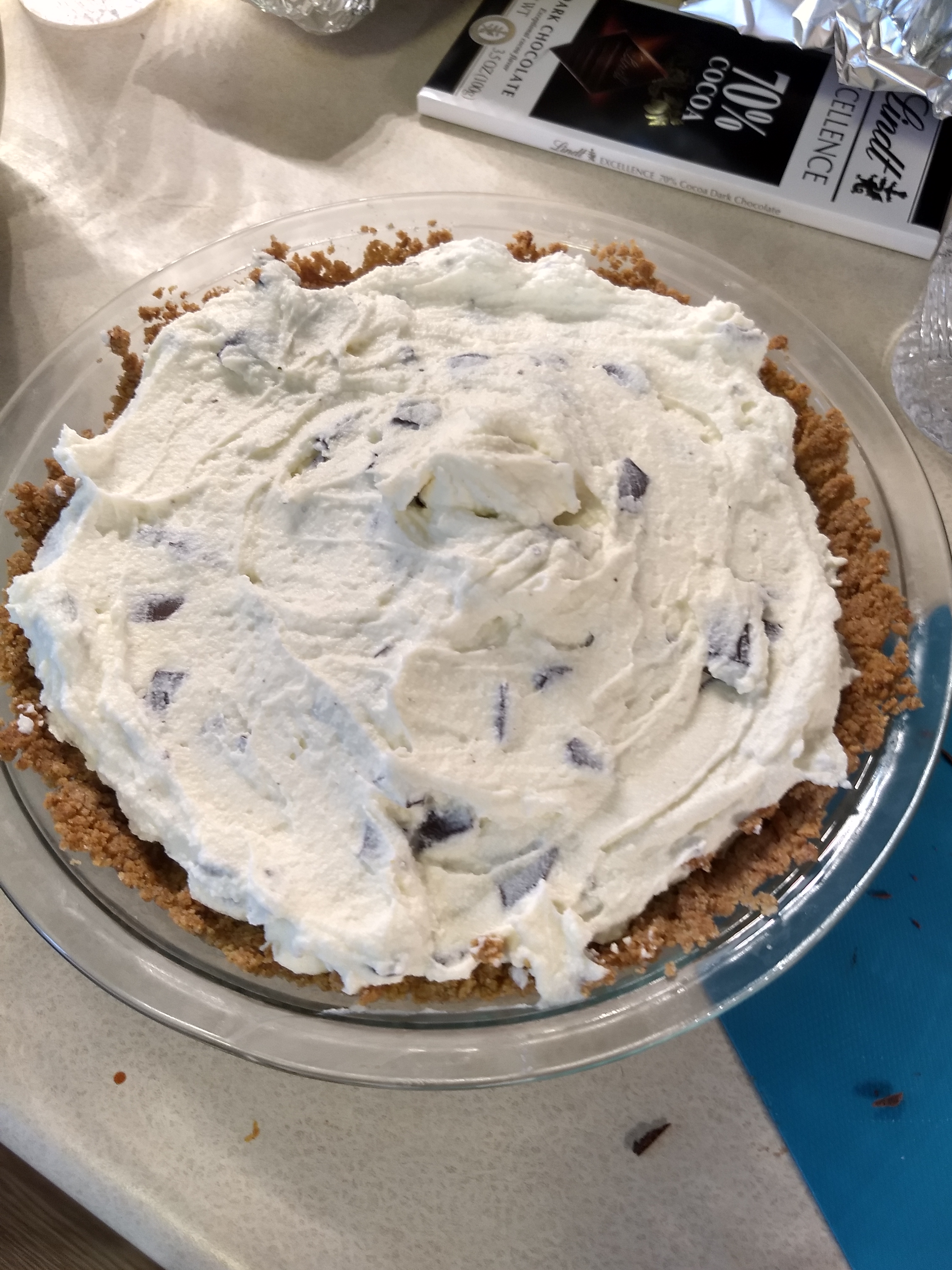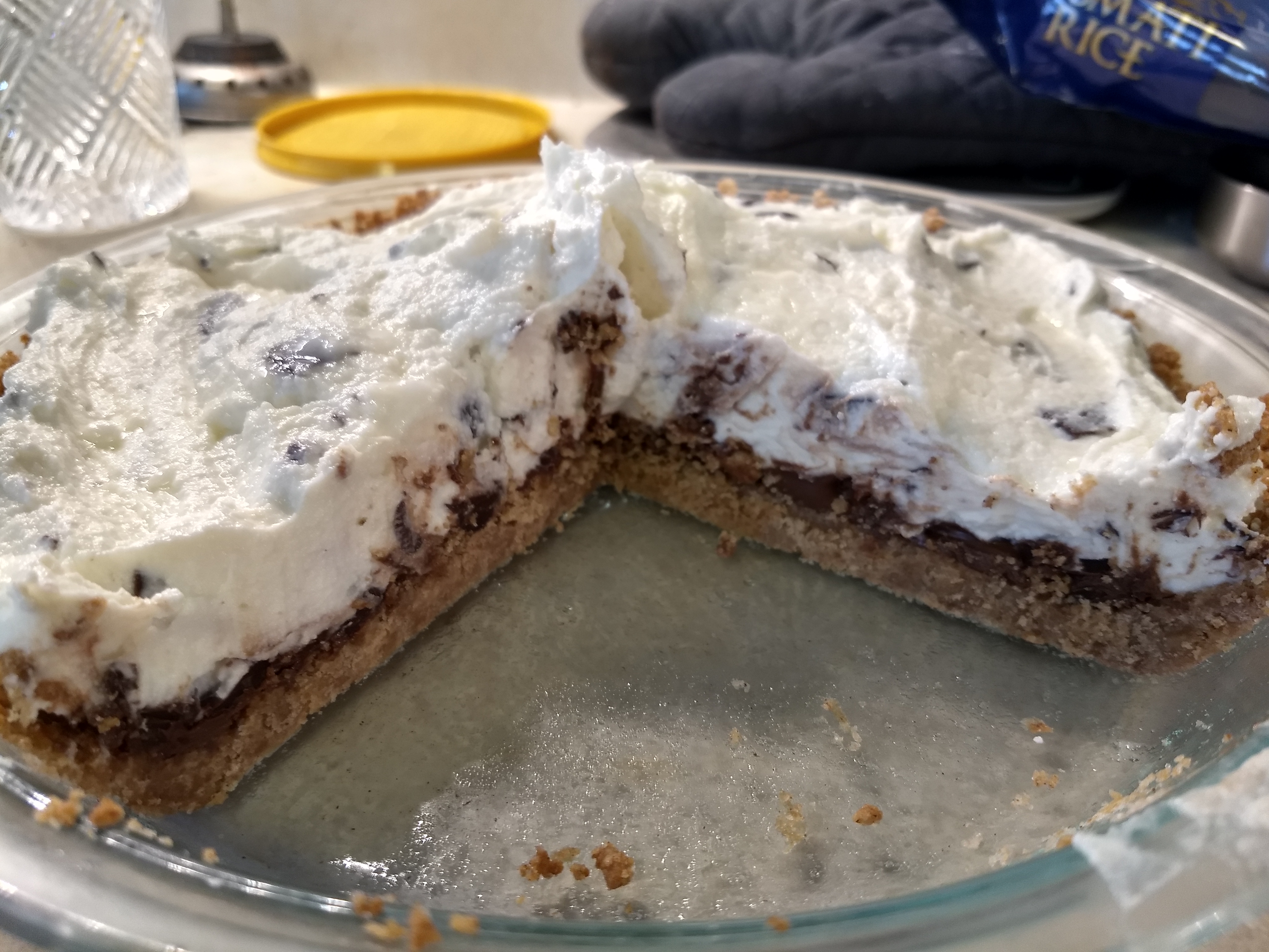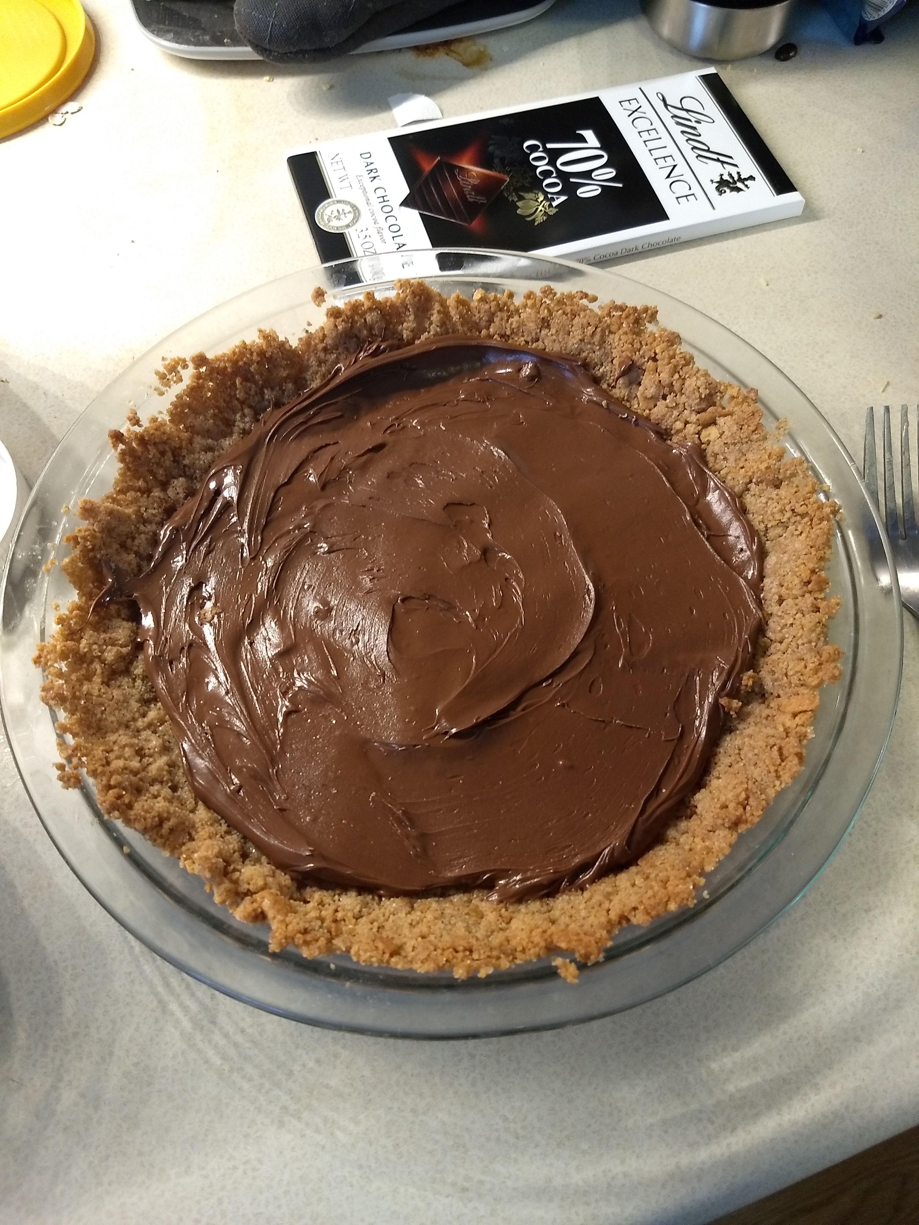 When I was in Rome a few years ago, I ordered a cannoli from an upscale restaraunt in Piazza Navona. While delicious, it vanished in three bites and left more emptiness than substance in my stomach. The vacant feeling followed me to graduate school until, in a Coleridge-esque fashion, inspiration came to me during a bout of research-induced sleep deprivation. Canolli in pie form would contain the filling efficiently and the handcrafted shells could be neglected entirely. The cracker crust and chocolate elements followed naturally while the addition of the hazlenut flavor was to ward off my allergy-prone roommate.