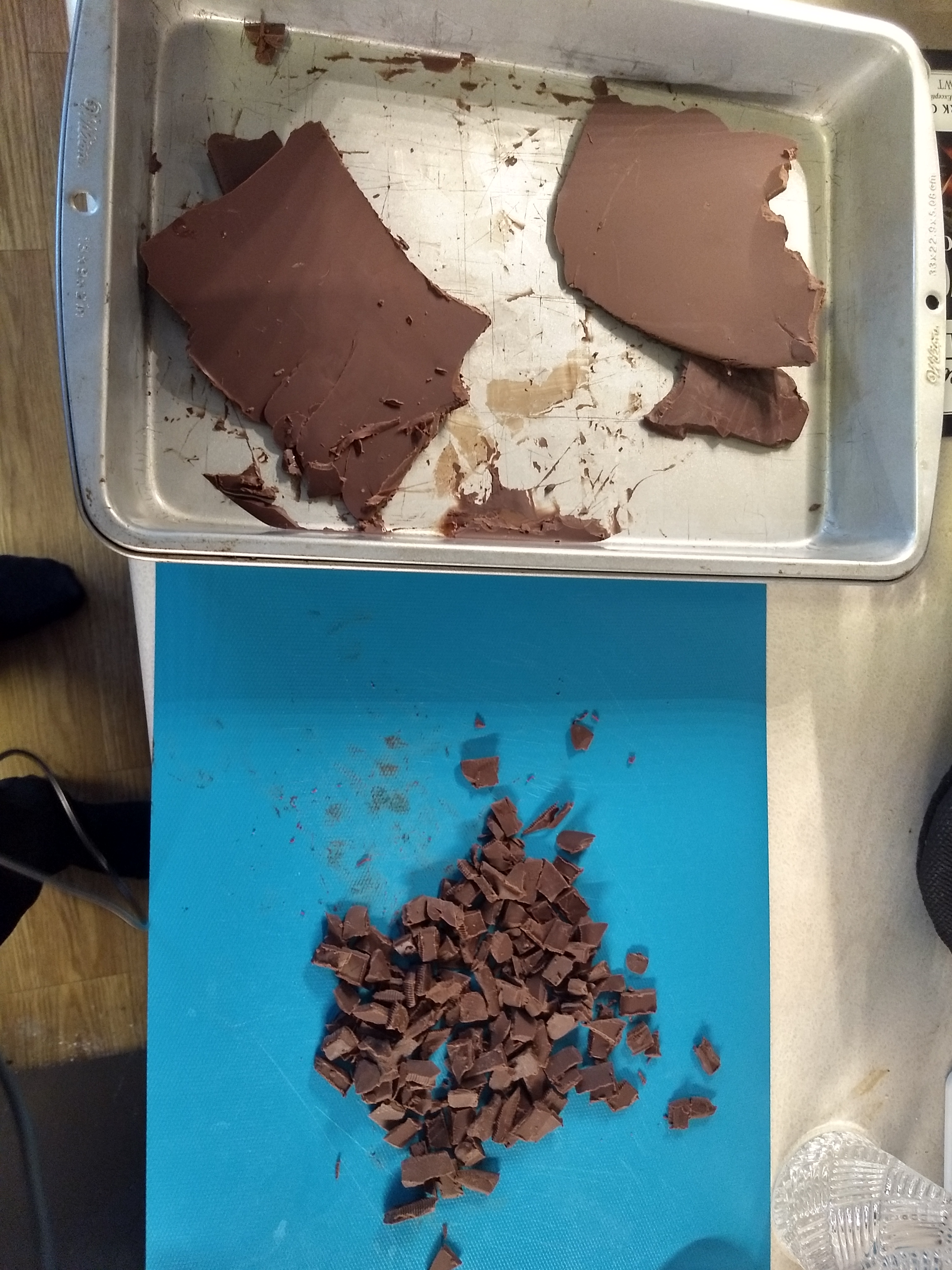 Melt the chocolate with a double broiler, then pour into a large (9-in by 13-in or so) metal baking pan (the chocolate won’t cover the whole dish). Let cool in refrigerator until hard, 45 min. Peel the chocolate sheets off with a spatula (this might have been easier with parchment paper). Make about 2c of 1-cm chips, then cut the rest into 1-inch squares. Mix the chips into the ricotta. Set aside the squares.