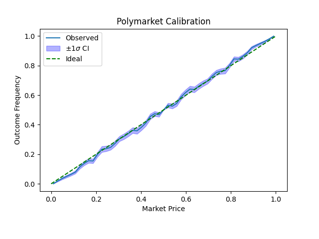 In the calibration plot shown, values below the ideal line correspond to overconfident predictions. But by-and-large the prices are well-calibrated. Even the tails, which are rife with market inefficiencies (transaction costs, delays resolving outcomes, etc.), only slightly deviate from the ideal. The \(\pm1\sigma\) confidence intervals are constructed by a 500-partition bootstrap resampling3.