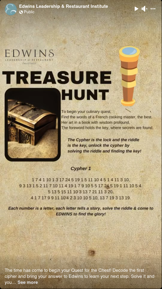 Jun 20, 2024Edwins, a local restaurant, put out an interesting promotion. They buried two fine bottles of wine somewhere in Cleveland, and said the first person to find them could claim them. As a clue, they released a cypher with a riddle. With time on my hands after finishing my PhD two weeks before, I figured I’d give it a shot.