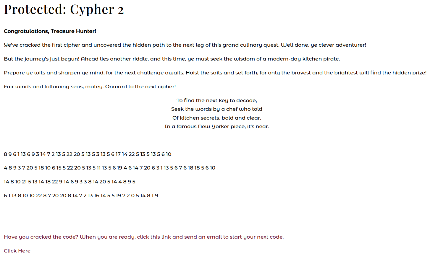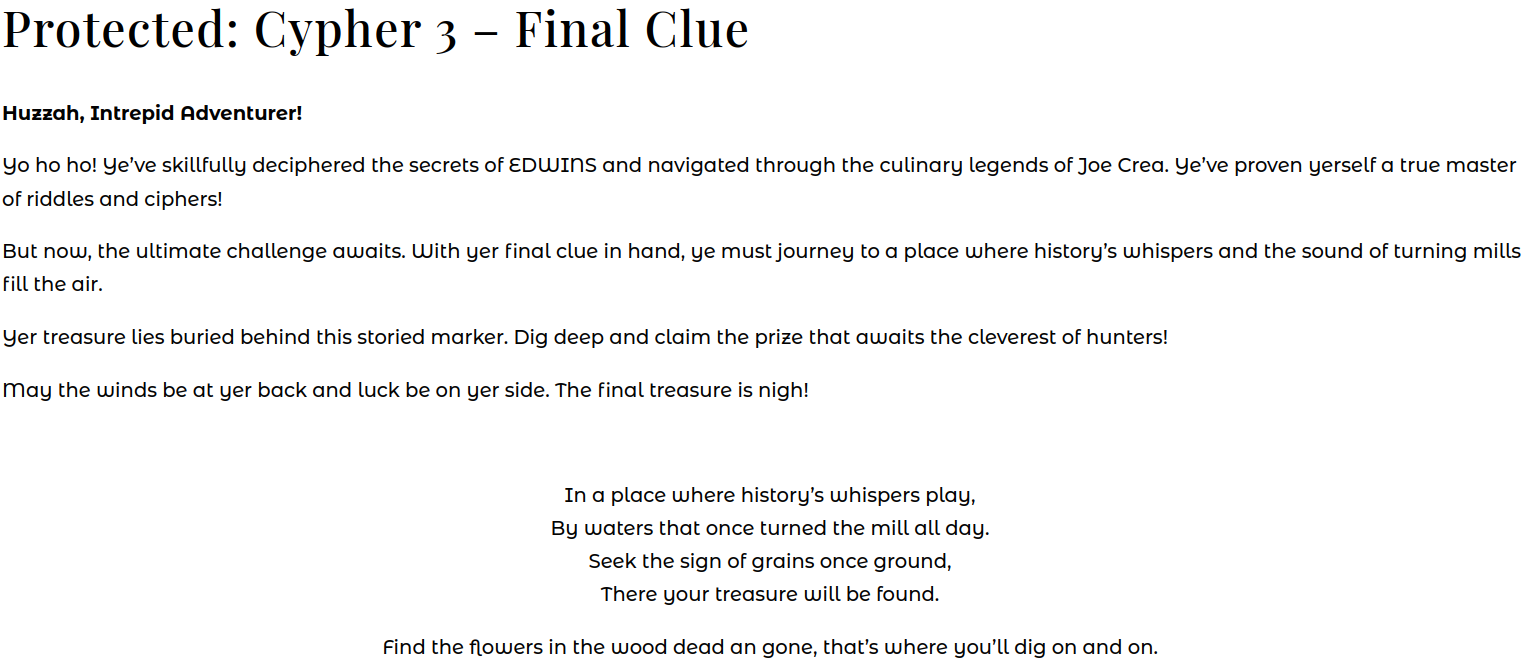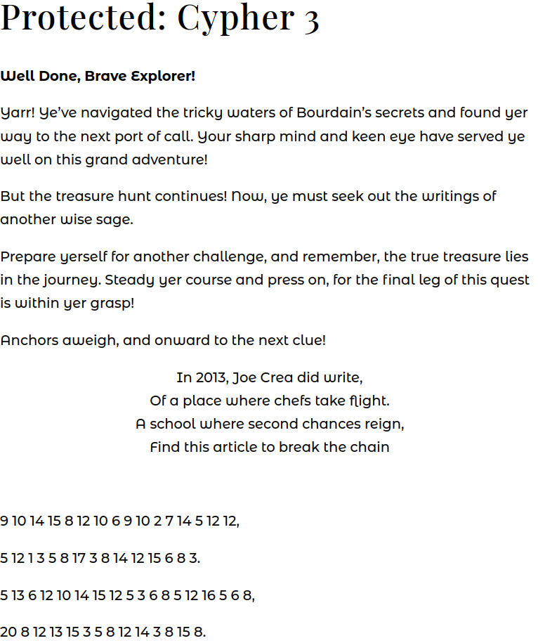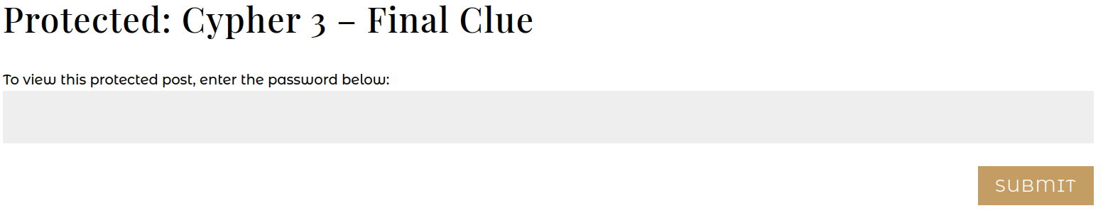 With some squinting, it starts with “histori” and mentions “aun ristraen”. Frankly, that information wasn’t surpsising given the answers to the last two clues were historic restaurants. I spent a week stuck here, trying different algorithms and substitutions. The other difficulty was that I didn’t see a Cypher 4 web page. After reexamining the XML sitemap, I noticed two URLs named “/cypher-2a” and “/cypher-3a”. And “/cypher-2a” linked to the page for Cypher 3! In turn, “/cypher-3a” linked to “/cypher-final”, with a brand new password box.