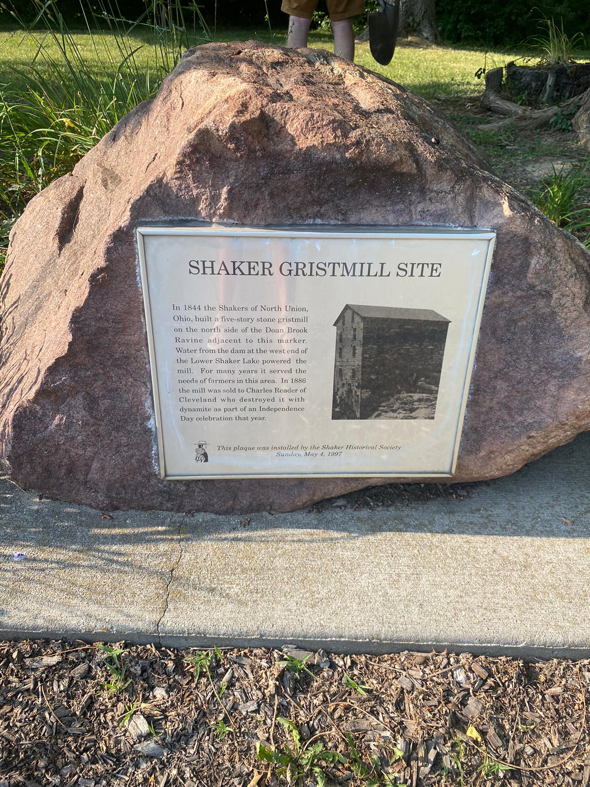 The final challenge, and no more cyphers. I queried my family for suggestions about mills, and did some digging by myself, and settled on the Shaker Gristmill as the top candidate. Armed with a shovel, I set out with my sister in the 85 F heat to the local park where the gristmill once stood.