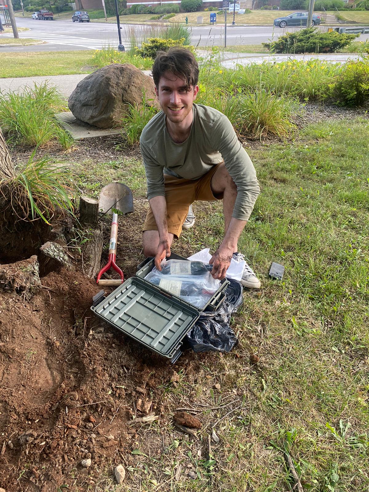 Near the plaque, there was a hollow tree stump with a small shrub growing in it. We carefully removed the plant and felt like tresspassers while we dug out a foot of earth. Finally, the shovel hit something hard, and we carefully excavated a large plastic box. We had found the wine!